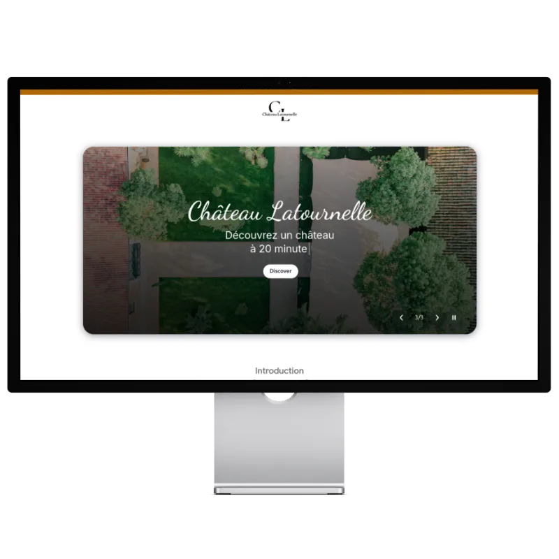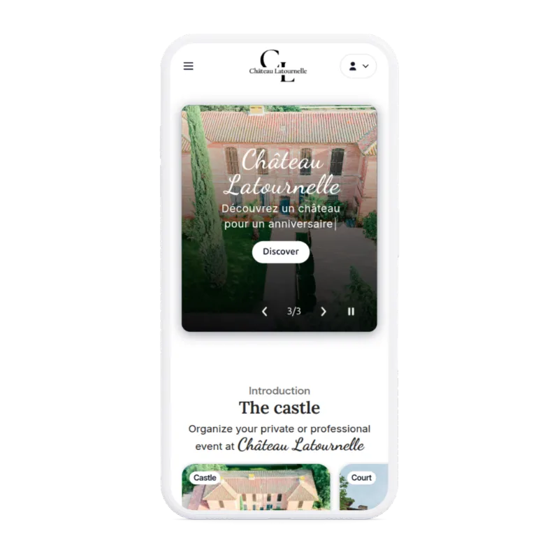 Introductory Banner: Aerial view of the château with welcome text and a clean “Découvrir” (Discover) button.